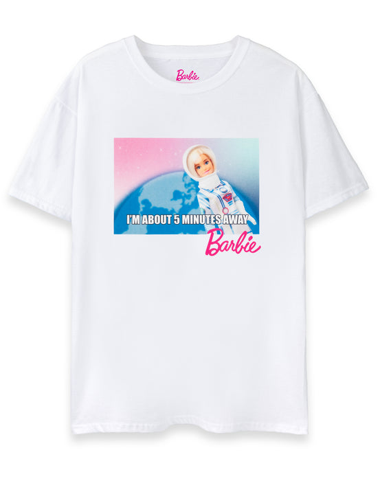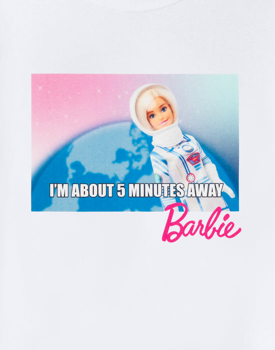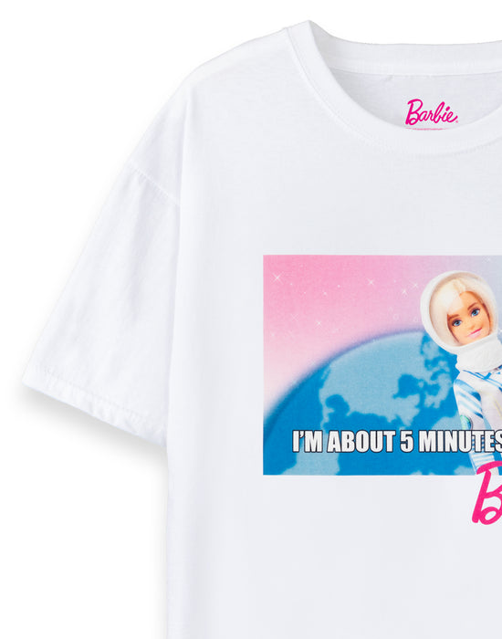 The Barbie 'Running Late' White Women's T-Shirt is a stylish wardrobe must-have, with a playful spin on the iconic quote and the doll in outer space.
