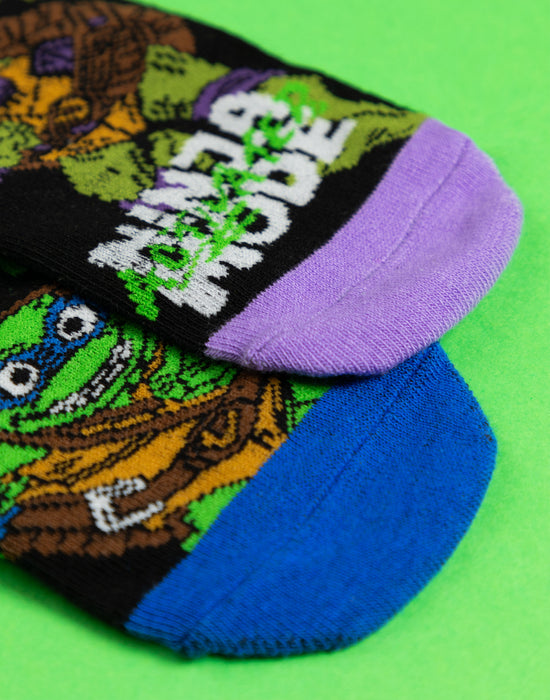 Each pair of socks in this vibrant set features colorful designs inspired by Leonardo, Donatello, Michelangelo, and Raphael-everyone's favorite heroes in a half-shell. From bold graphics to turtle-themed patterns, these socks are crafted for comfort and durability. Whether your little ninja is training in the dojo or battling Foot Clan villains, these socks keep feet cozy and cool. Treat your TMNT enthusiast to this dynamic sock set that adds turtle power to their wardrobe.