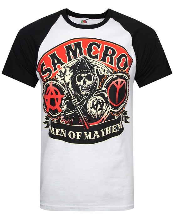 Get patched in in style with this awesome official Sons Of Anarchy Men of Mayhem mens raglan t-shirt, packed with detail this officially licensed t-shirt is a must have for any fans of the hit FX TV show. The large print across the front of the t-shirt showcases the iconic reaper mascot used by the fictional motorcycle club, this vivid design is packed with detail including the SAMCRO logo, Anarchy logo, Men of Mayhem banner and more. This print has strong and bright colouring in red, black and off white this mens official Sons Of Anarchy banner t-shirt comes in a raglan design with a white body and black sleeves and neck. We want you to be rocking this look for as long as possible, please follow care label instructions carefully./