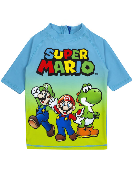 It is perfect for making more gaming fun on their holiday adventures, enjoying swimming lessons, beach and pools days whilst keeping them comfortable and safe from the sun! The swimming suit for boys comes in a two piece style with a blue to green ombre Super Mario top and shorts.