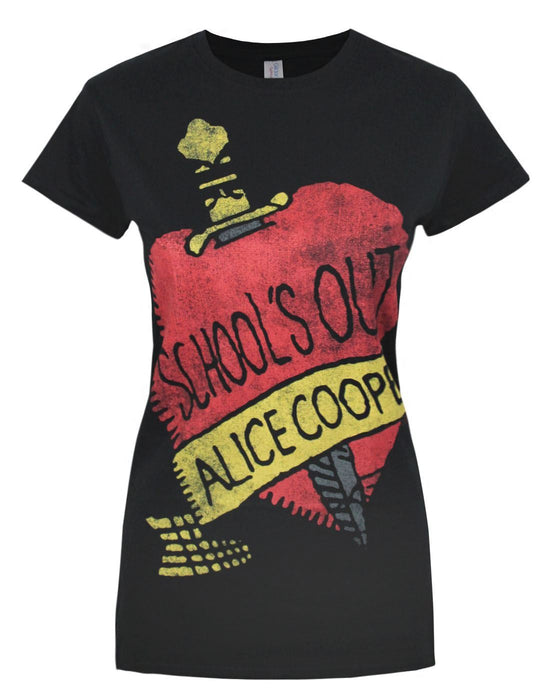 This official Alice Cooper Schools Out t-shirt for women is a cool addition to any fans wardrobe, featuring a large print inspired by Alice Coopers 5th studio album ‘Schools Out. This officially licensed Alice Cooper merchandise features the iconic dagger through the heart icon found on the Schools Out album cover artwork and linked to the Alice Cooper image. The large design is printed for a cool rock n roll distress effect and offers vivid and bright colouring with a graphic cartoon style look. Offering a regular fit this ladies t-shirt comes in a classic black, made with 100% cotton this official Alice Cooper Schools Out ticks all the right boxes.