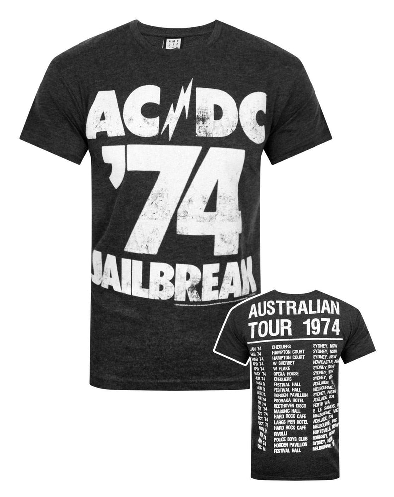 Grab yourself a bit of music history with this classic AC/DC Jailbreak 74 print t-shirt, coming straight from the London based brand Amplified clothing this mens t-shirt features all the details youve come to know and love. This mens t-shirt sees a distress effect print in white across the front, faded black colour, crew neck and short sleeves. This Amplified AC/DC t-shirt also features a large back print that showcases tour dates from the 1974 Australian tour in crisp white. Made with 100% cotton this AC/Dc Jailbreak faded black t-shirt for men offers a standard fit. We want you to get the most possible out of this t-shirt, please refer to the size guide for more information on sizing.