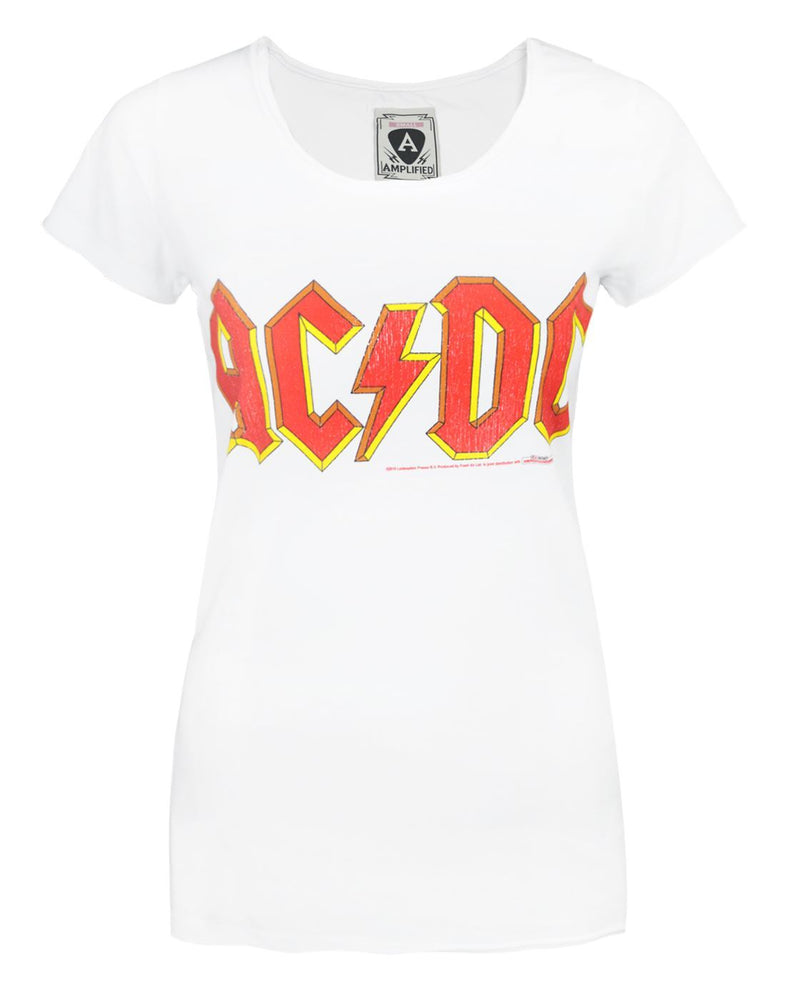 Grab yourself a piece of AC/DC goodness with this official Amplified AC/DC logo womens t-shirt. Founded on crisp white ladies t-shirt this classic AC/DC logo sits in striking red and yellow mirroring the traditional AC/DC logo colours. And if this wasnt enough you can find all the classic Amplified features such as distress effect, flattering scoop neck and raw edge hems to add to the overall rock n roll feel of this slim fit womens t-shirt.