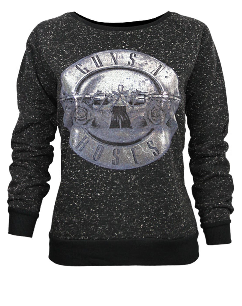 The only way to cover up and keep warm is the Guns N Roses way, get comfy in this Amplified Guns N Roses slim fit womens sweater featuring ribbed cuffs, hem and neck. The unique black speckle effect works perfectly with the official Guns N roses foil effect classic logo giving this vintage feel ladies sweater that extra edge. Cotton mix and machine washable at 30c this Amplified sweater offers a modern twist on a Guns N Roses classic. This ladies sweater has a cute cropped style meaning the hem sits just above the hips, making it a perfect fashionsita piece!