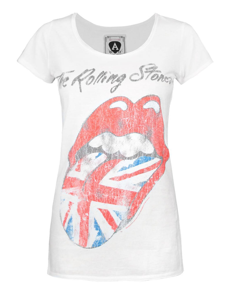 This Amplified Rolling Stones womens t-shirt is jam packed with awesome fashion features, including raw edge scoop neck, hem and sleeves, vintage wash finish and overall rock n roll inspired distress effect. Putting a spin on the classic Rolling Stones tongue logo this Amplified Rolling Stones ladies slim fit t-shirt features a UK version of the official ‘Lick print, with a distressed effect Union Jack style design that shouts rock chic style.