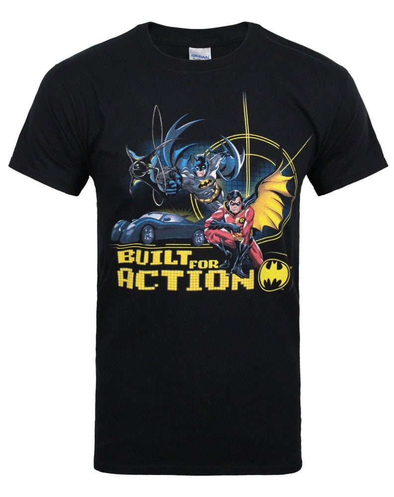 Officially licensed this Batman Built For Action mens t-shirt is a cool addition to any guys wardrobe, featuring an alternative retro inspired design. The print showcases the iconic Batman and Robin characters in a cool comic book look, with vivid colouring this graphic print sees batman firing a weapon through the air with Robin crouched beside him and the classic Batmobile in the background. The tongue in cheek Built For Action text is printed in bright yellow across the bottom of the t-shirt.