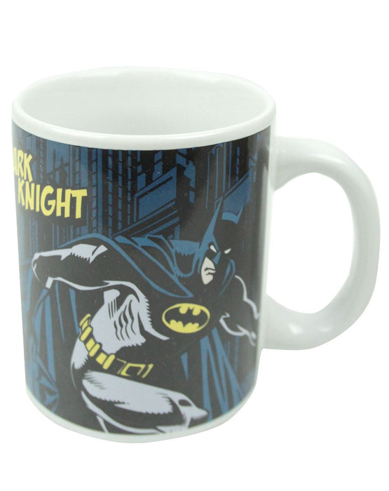 Add some superhero vibes to your kitchen cupboards with this awesome official Batman The Dark Knight mug! This design sees the iconic DC Comics character in The Dark Knight form; with his long masked cape, grey suit and yellow utility belt. The background sees the dark streets of Gotham along with 'Dark Knight' in yellow along the side; the print has a graphic look finish in keeping with the dark Batman style. The mug has a vibrant and high quality look, filled with detail and offering a good quality finish. This Batman The Dark Knight mug comes in crisp white and offers a standard mug size. This Batman mug is packaged in a presentation gift box making it a perfect gift option all year round! This mug is dishwasher and microwave safe.