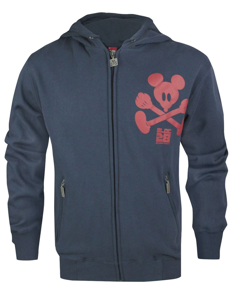 This is Disney like you've never seen it before! Welcome some Bloc28 into your wardrobe with this awesome Bloc28 Cross Bones Zip Up Hoodie for men. This hoodie showcases a striking design that sees the bold Bloc28 mouse and cross bones logo in vibrant red emblazed across the side of the zip up. This bold print sits against the indigo blue of the zip up hoodie making it a stand out addition to any fashion lovers wardrobe. Made with 100% cotton this men's Bloc28 Cross Bones Logo Zip Up hoodie has a soft to touch feel with a fleecy inside lining; along with this the zip up has a drawstring hood, long sleeves and a metallic zip with Bloc 28 branding on the zip. This men's indigo blue zip up hoodie has official Bloc28 branding through out and is machine washable at 30c, the hoodie also has metallic zip up pockets with branded zips. Packed with quality this men's Bloc28 Cross bones Logo Zip Up is a premium addition to any fashion lover's wardrobe.