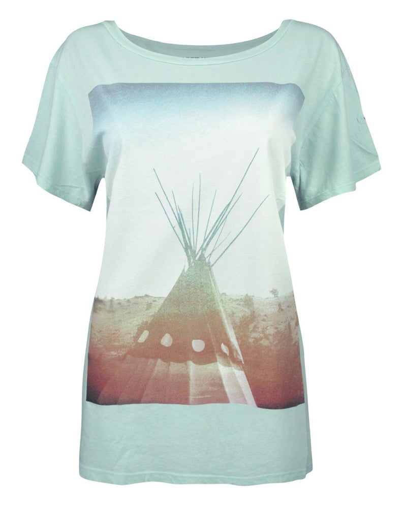 The ultimate fashion t-shirt brand, Blood Is The New Black are a born in the USA brand offering high end photography style printed t-shirts. This Blood Is The New Black Carey Haider Teepee women's t-shirt is just the thing for festival season. Showcasing an gorgeous sunset and tepee faded print, this ladies t-shirt works with a flattering boyfriend fit made with 100% cotton and washing comfortably on a warm wash. This Carey Haider designed women's t-shirt includes cap sleeves, split hem design on the back of the t-shirt and a slightly overall faded finish.