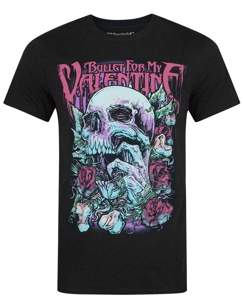 Add this to your Bullet For My Valentine t-shirt collection! Officially licensed, this Bullet For My Valentine Red Eye Skull t-shirt is a must have for fans! The large print across the front of the t-shirt sees a detailed design featuring a skull and roses in a cool green, purple and pink colour combination. This detailed design makes this a real stand out band t-shirt finished off with the classic Bullet For My Valentine logo in bold across the top of the shirt. This mens t-shirt offers a standard fit with a crew neck and short sleeves, made from 100% cotton this Bullet For My Valentine t-shirt has a comfortable fit and feel. Please follow all care label instructions carefully and ask for additional sizing information if needed.