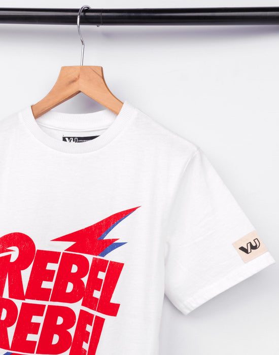 Little Bowie fans will be rocking around in this white Rebel Rebel song t-shirt!