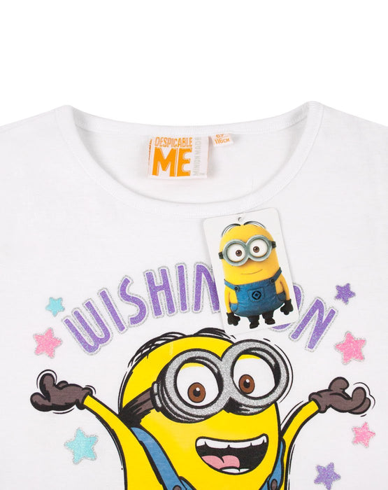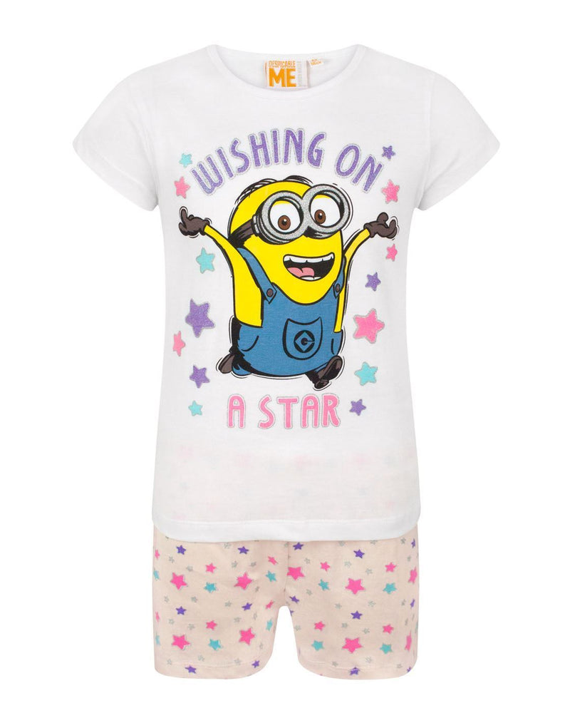 Add some mischief to your little ones bedtime with these adorable Despicable Me Wishing On A Star girls pyjamas! Officially licensed, these pyjamas come in a short sleeve top and shorts combination. The eye-catching design across the front of the top features a colourful print of a Minion happily frolicking, backed by a glittery blue, pink and purple stars. The adorable print is framed by the slogan “Wishing On A Star” in purple and pink glittery fonts. This pyjama top comes in a crisp white in a crew neck and short sleeve style while the shorts offer an elasticated waist and come in an peachy pink with a repeated star print. An officially licensed Despicable Me product, these pyjamas feature official branding throughout. To ensure you get the most from this product, please follow care label instructions carefully.