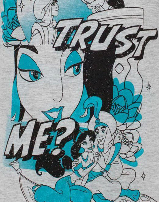 The print across the front of the garment combines iconic images of Aladdin and Jasmine, including the standout magic carpet ride scene from the classic animated film in a cool blue and black collage design. Completed by the slogan “Trust Me?†this print is packed with detail. Offering a crew neck and short sleeve style, this t-shirt comes in a grey marl and is made from 97% cotton, 3% polyester for a comfortable feel. To get the most from this product, please follow care label instructions carefully. Official Disney merchandise Perfect for little Disney fans Features iconic images of Aladdin and Jasmine Grey marl tee in a crew neck and short sleeve style, UK sizing 97% Cotton, 3% Polyester