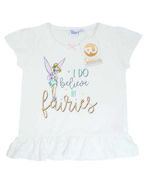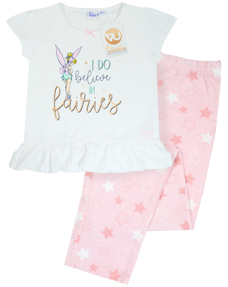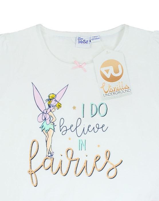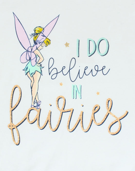 Inspire some Disney magic with these super cute Peter Pan Tinkerbell pyjamas for girls! This gorgeous two piece PJ set showcases the iconic Neverland fairy Tinkerbell with a sweet slogan style print that's reads 'I do believe in fairies' set against the crisp white of the pyjama top. This loungewear set comes with long style bottoms featuring an all over star design against a pale pink background, matched with the short sleeve top that comes with scoop neck and frilled hem to add a girly bedtime feel. Perfect for little ones these Disney pjs offer a comfortable fit and feel. This item is 100% genuine licensed Disney merchandise & features official branding throughout. We want you to get the most out of your new nightwear set, so please be sure to follow all care label instructions and contact our dedicated customer service team for any additional information or sizing queries.