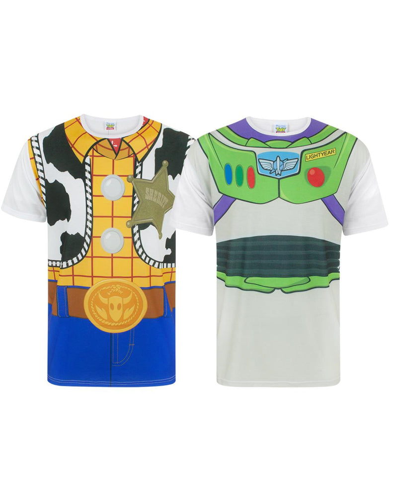 Transform into your favourite Toy Story characters with these awesome officially licensed Toy Story costume style tees! A nostalgic addition to your wardrobe these t-shirt showcase the outfits worn by the iconic Disney Pixar characters Woody and Buzz Lightyear in great attention to detail. A must have for costume parties, fancy dress or cosplay these shirt feature bold prints across the front with a plain white back. Made for a fun feel these are officially licensed Disney merchandise, please follow are care label instructions carefully.