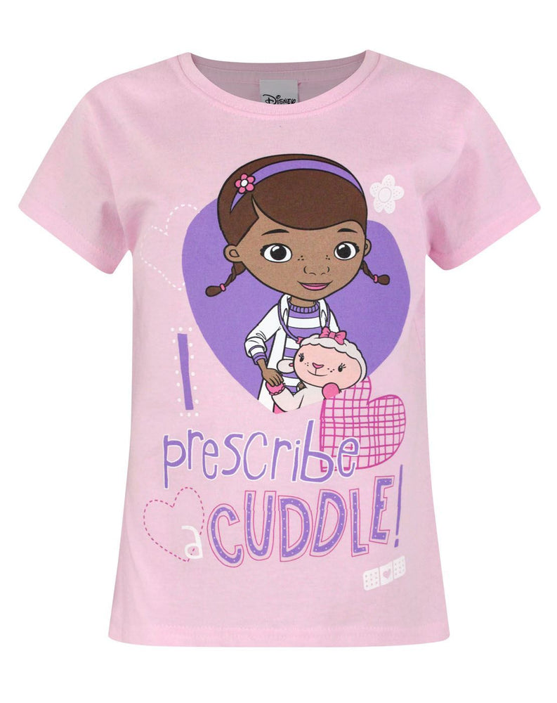 Officially licensed this Doc McStuffins Cuddle girls t-shirt is a must have addition to any little fans wardrobe. An officially licensed piece this childrens t-shirt is taken from the animated kids TV programme Doc McStuffins; the print across the front of the t-shirt showcases the main character Dottie McStuffins in a cute heart shaped design with the text ‘I prescribe a cuddle tying the look together. This fun print is packed with colour and stands out against the pink of the t-shirt; made with 100% cotton this girls t-shirt has a soft and comfortable feel and finish. This Doc McStuffins Cuddle girls t-shirt is an officially licensed product, please ask for additional information about sizing if needed.