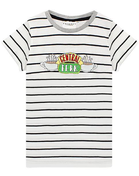 The Friends pyjamas for children feature the iconic Central Perk "Coffee House" logo that appears throughout the famous sitcom contrasted against a cool stripy black and white Friends t-shirt making the perfect gift for them little Friends fans!