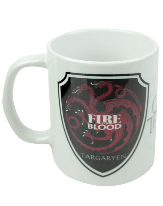 Massive Game of Thrones fan? This awesome officially licensed Game of Thrones Targaryen mug is a must have mug for you. This mug features the shield and sigil for House Targaryen, featuring their motto 'Fire and Blood'. This mug also features the official Game of Thrones logo along the side, the House Targaryen shield comes in black sees a red three headed dragon across the front. This official Game of Thrones Targaryen mug comes in crisp white and offers a standard mug size, a perfect piece for any Game of Thrones fan this mug offers an alternative to the traditional Game of Thrones merchandise. This Game of Thrones mug is packaged in a presentation gift box making it a perfect gift option all year round! This mug is dishwasher and microwave safe.
