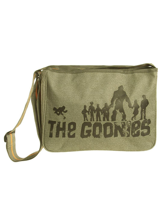 This official The Goonies canvas bag is the perfect way to add a touch of retro inspired fun to your outfit. The stylish bag feels great and looks even better, packed with cool and handy features. The design across the front of the bag sees The Goonies classic logo across the front with the cast silhouetted above it. This print has a distress effect look adding to the retro feel; the bag also features a small print that reads Never Say Die with the crossed swords and skull. Officially licensed this The Goonies bag has a large inside compartment, with inside zip pocket as well as a long zip section across the back. Made with a quality feel and finish this The Goonies bag is made with a stylish canvas material in a cool khaki green colour, the bag has an adjustable jacquard strap for extra comfort along with a zip along the top for extra ease of use. This The Goonies bag measures approximately 39cm x 26cm, please follow care label instructions carefully.