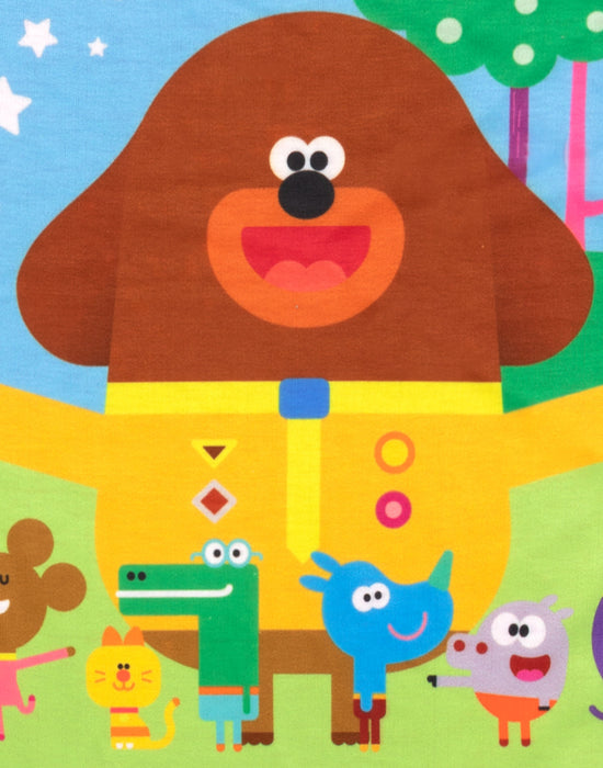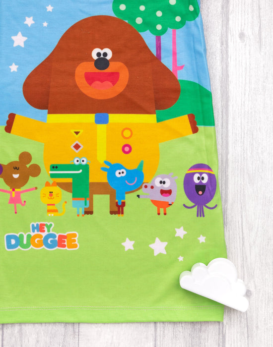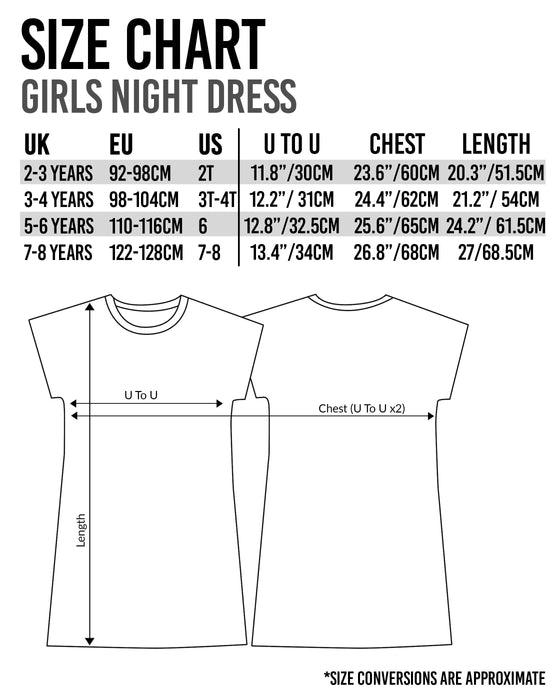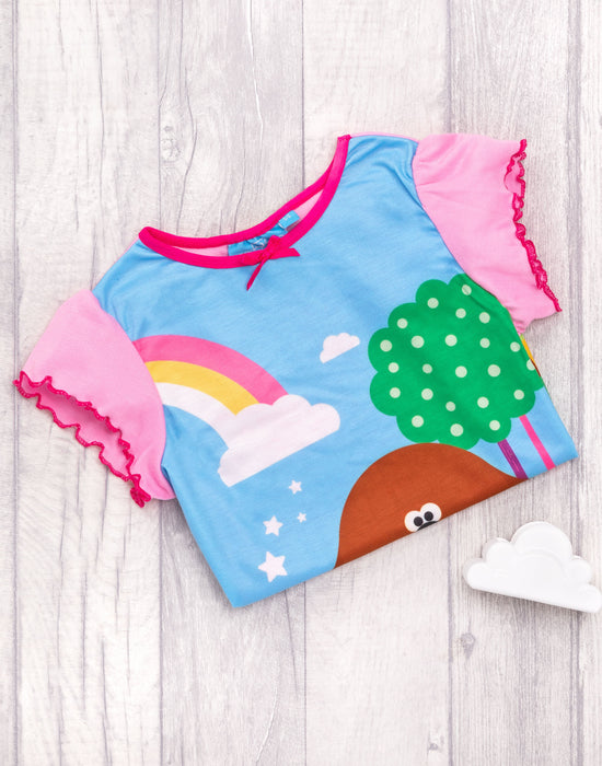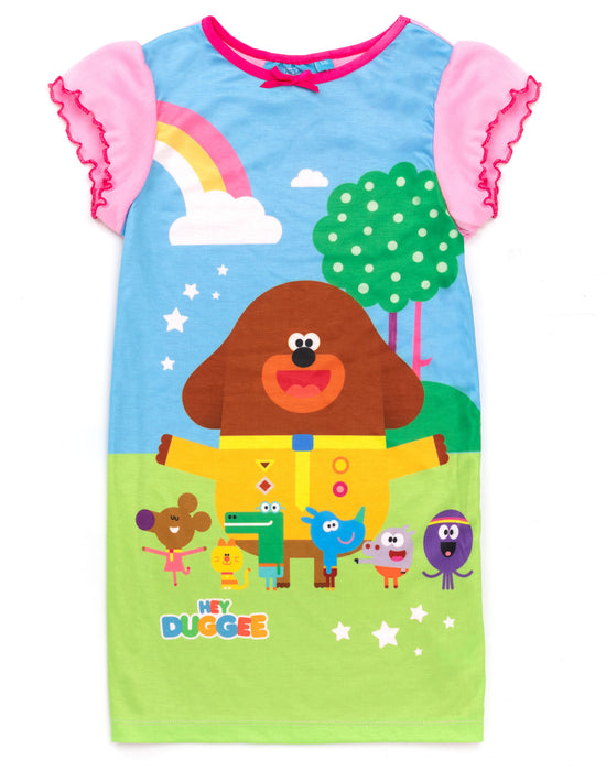 Your little ones will be dreamy of the most wonderful adventures with their favourite pooch Duggee in this adorable Hey Duggee girls nightdress. Featuring the happy Squirrel Club; Duggee, Betty, Roly, Tag, Happy, Enid and Norrie surrounded by rainbows, stars and of course Duggee's hugs. This nightie is multicoloured and featuring pink frilled sleeves and a crew neck with a pink bow detail. The kids nightwear is made from 100% polyester for extra comfort at nighttime and is perfect for your little squirrels.