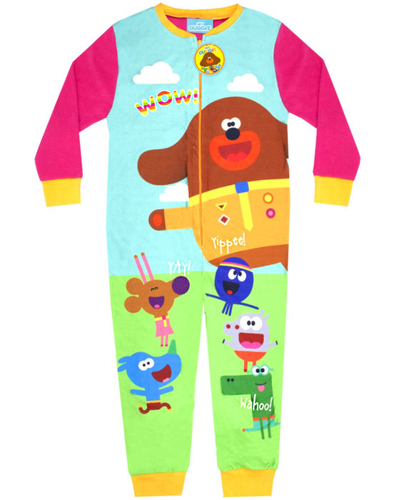 Your little ones will be having sweet dreams in this adorable Hey Duggee girls onesie. Featuring only positive vibes with quotes WOW!, YAY. Yippee and Wahoo! scattered around the members of the Squirrel Club; Duggee, Betty, Happy, Norrie, Roly and Tag. The kids all-in-one comes in pink with multicoloured accents including orange cuffs on the long sleeves and full-length legs. Made from microfleece, this sleepwear is perfect for your little ones in the colder weather and has an easy to fasten pull zip. This item is 100% genuine licensed Hey Duggee merchandise & features official branding throughout. We want you to get the most out of your new onesie, so please be sure to follow all care label instructions and contact our dedicated customer service team for any additional information or sizing queries.