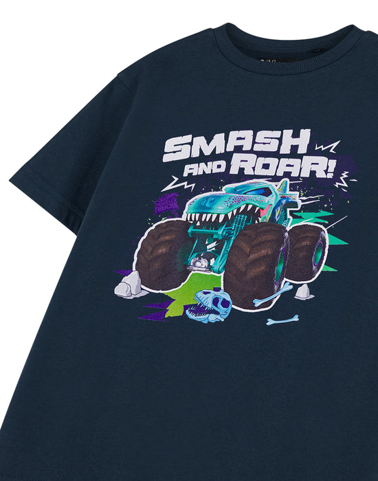 Rev up the excitement with our Hot Wheels Monster Trucks Kids Navy Short-Sleeved T-Shirt!