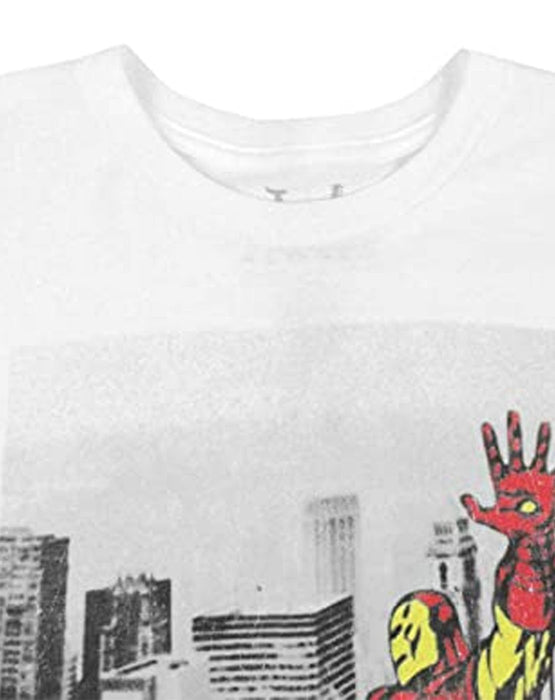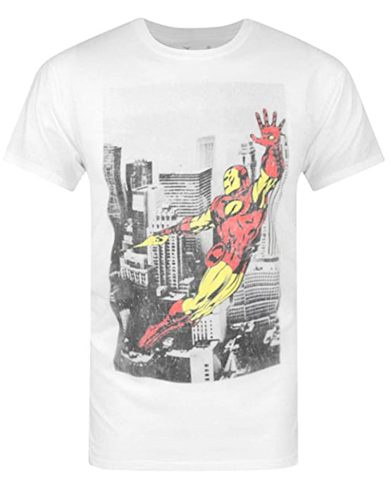 This official Jack Of All Trades Iron Man New York mens t-shirt is a must have addition to every superhero fans wardrobe! Officially licensed this awesome t-shirt sees the iconic superhero Iron Man flying through the sky with New York in the background beneath him. The artwork is printed with a traditional comic book look in mind, the new York backdrop has a old school black and white photography look with Iron man seen in full red and yellow colour. The print has a distinctive distress effect with faded elements through out. Made with 100% cotton this mens t-shirt has a soft to touch feel and comes in crisp white; the t-shirt offers a standard mens fit and has traditional crew neck and short sleeves. We measure all stocked brands in house, please ask a member of the VU team for the best size option for you.