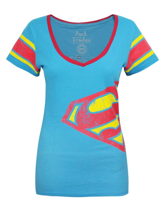 This official Jack Of All Trades Superman Logo womens Jersey is a must have addition to every superhero fans wardrobe! Officially licensed this jersey style ladies t-shirt comes in a vivid blue, the t-shirt has a contrast red neck in a v neck style. The sleeves feature a striped red and yellow design with a matching Superman Logo across the front of the t-shirt finished in a distress effect look. The Superman logo sits slightly off kilter adding a cool twist on the traditional superhero merchandise style. Made with 100% cotton this ladies Superman jersey t-shirt has a soft to touch feel and high quality look. This official Superman jersey t-shirt offers a slim fit, officially licensed this Superman Logo t-shirt is fresh from Jack Of All Trades. We want you to get the most out of this t-shirt as possible, please follow care label instructions carefully.