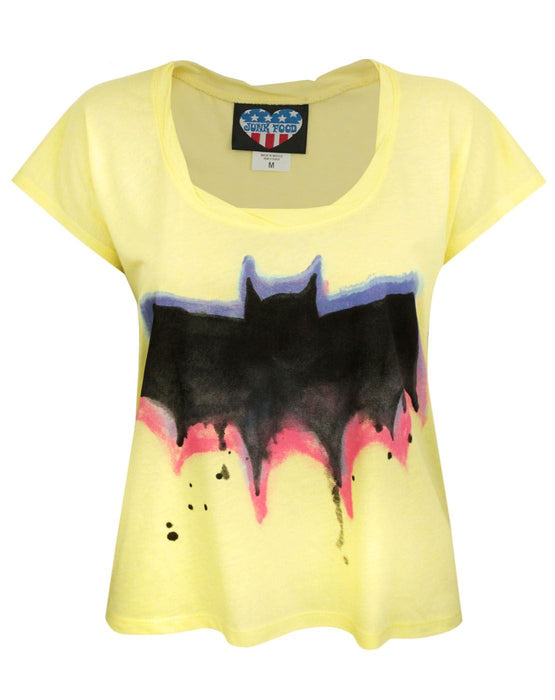 Fresh from the USA this Junk Food Batman Graffiti Oversized ladies cropped top is an awesome addition to any girls wardrobe! This top offers a fun fashionable feel, with a cool twist on the classic Batman style. This design sees the Batman bat signal across the front of the t-shirt in a distinctive graffiti inspired look. The classic bat signal is seen with a black, purple and pink spray paint finish with a drip and splatter look. Made with a high quality feel this ladies Junk Food t-shirt comes in a bright yellow colour and features short sleeves, round neck and oversized cropped fit. The top has a stand out look with an oversized or relaxed fit and cropped style meaning it sits slightly higher that a regular fit t-shirt. We want you to get the most possible out of this Batman Graffiti womens cropped top, please follow care label instructions carefully.