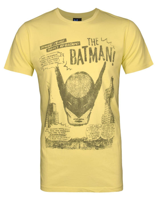 Fresh from the USA this Junk Food Batman Beware Crime Theres No Escape t-shirt features the classic Batman character in a cool retro style print. Offering a relaxed fit, this vintage yellow mens t-shirt comes with crew neck and short sleeves. The large Batman print features a comic book style design with a nod to the pop art era and sits across the front of the t-shirt, with a heavy distress effect. Made from 100% cotton and washing comfortably at 30c this fashionable Batman Beware Crime Theres No Escape mens t-shirt offers both comfort and fun.