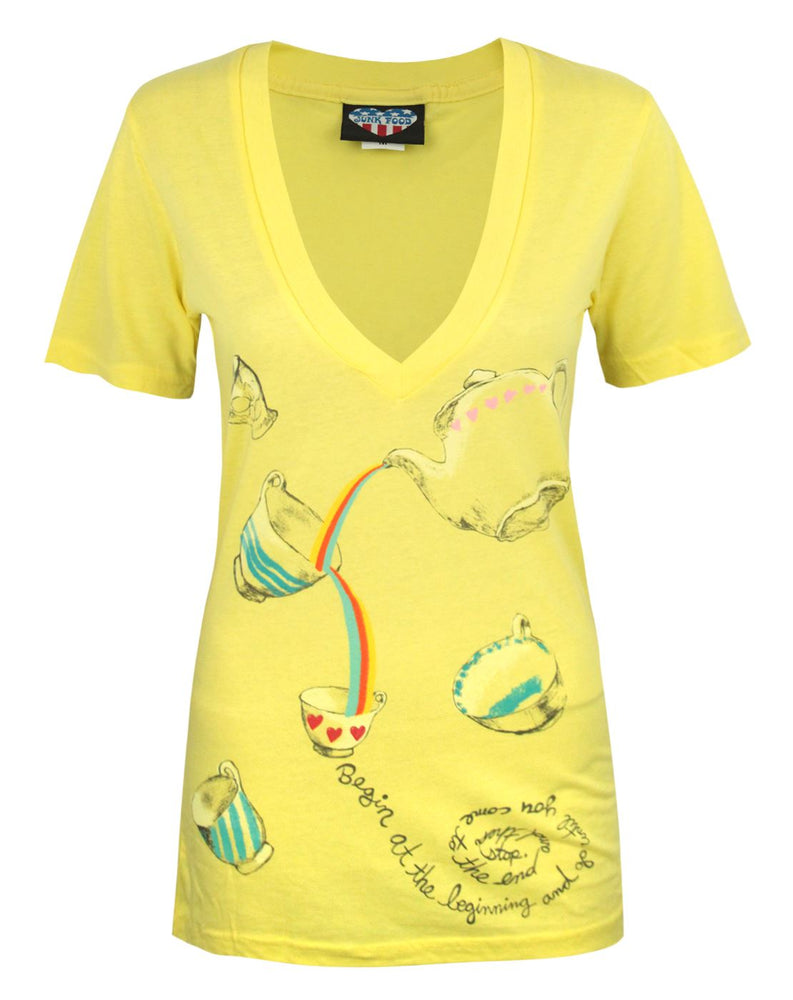 Fresh from the USA this Junk Food Alice In Wonderland Tea Party women’s t-shirt is pure retro fun. Featuring a large front print this t-shirt is inspired by the classic Alice In Wonderland novel and film, the design showcases a cute tea party print in a vintage style. Made with 50% cotton, 50% Polyester this Alice In Wonderland Tea Party women’s t-shirt comes in a bright yellow and offers a fashionable v neck. This t-shirt has official Junk Food branding through out, please follow washing instructions on care label carefully!