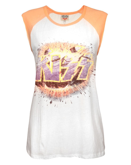 Fresh from the USA this Junk Food Kiss Explosion womens t-shirt is a cool addition to your t-shirt collection. Featuring a faded retro print that Junk Food are known for this ladies t-shirt is offering a fun twist is the classic music t-shirt style. With a slouchy fit this flattering fashion t-shirt showcases an awesome KISS print with a baseball style orange contrast sleeve detail. The overall distress effect gives this ladies t-shirt a vintage finish; made from 100% cotton and machine washable at 30c this t-shirt offers both style and comfort.