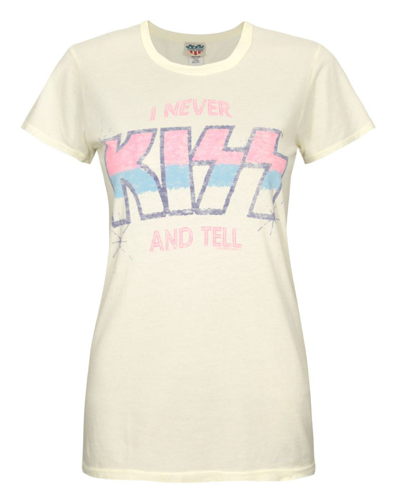 Fresh from the USA this Junk Food I Never Kiss And Tell womens t-shirt is a cool addition to your t-shirt collection. Featuring a faded retro print that Junk Food are known for this ladies t-shirt is offering a little bit of music related fun. With a slim fit this flattering fashion t-shirt showcases a cute KISS inspired print with a tongue in cheek slogan style. The overall distress effect gives this ladies t-shirt a vintage finish, made from 100% cotton and machine washable at 30c this t-shirt offers both style and comfort.