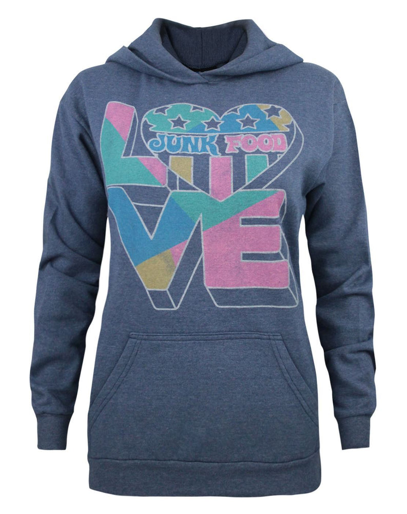 Fresh from the USA this Junk Food Love Junk Food womens hoody is a cool addition to any girls wardrobe. Featuring the Junk Food logo from American Clothing brand this Junk Food hoody is packed with fashion features. Made with a soft cotton mix this, ladies hoody offers a oversized and relaxed fit, including a stylish hood and handy pocket pouch. Official Junk Food clothing this womens Love Junk Food hoody features distress effect print set against a striking blue colour and is finished with a retro and vintage feel, machine washable at 30c this Junk Food t-short offers both style and comfort.