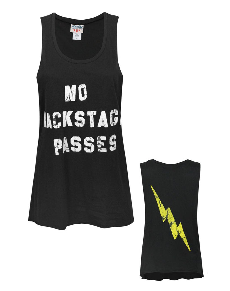 Fresh from the USA this Junk Food No Backstage Passes womens vest is pure rock n roll fun. Featuring a cool distress effect slogan style print across the front that reads ‘No Backstage Passes and a lightning bolt print with crackle effect across the back this vest really packs a punch. Made with a soft charcoal material this ladies vest is made with 100% cotton and has deep muscle tee armholes with raw edges. Offering a relaxed fit this Junk Food vest has a slight scoop neck with hi – low hem detail.