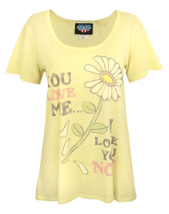 Fresh from the USA this Junk Food You Love Me, I Love You womens t-shirt is the perfect way to get that laid back L.A look in style. The t-shirt features a large print across the front showcasing a cute design that reads ‘You Love Me, I Love You Not with an image of a daisy with picked petals. This sweet design is printed for a faded or vintage inspired feel, with a subtle distress effect and washed out finish. The t-shirt comes in soft yellow and has a round neck, short sleeves and standard fit. Made with 50% cotton, 50% polyester this Junk Food ladies t-shirt has a lightweight feel and features Junk Food branding through out. We want you to get the most possible out of this t-shirt, please follow care label instructions carefully.