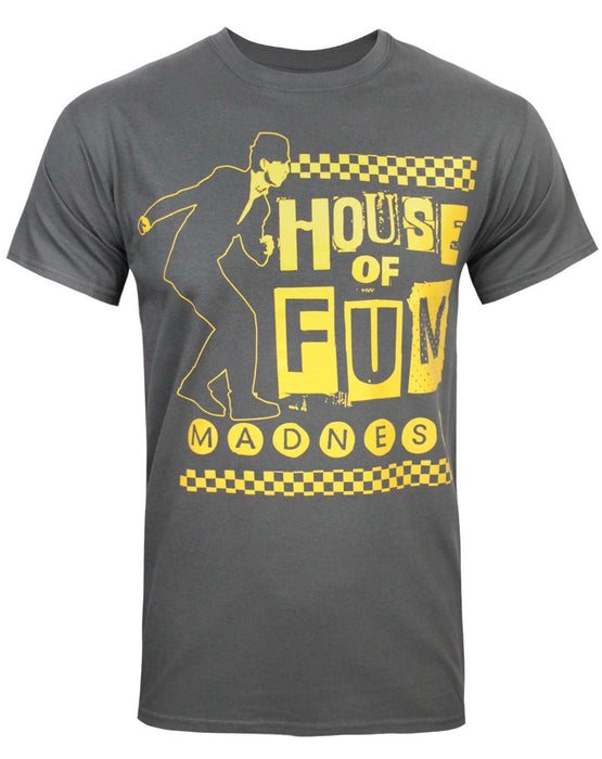 This official Madness House Of Fun t-shirt for men features a large print inspired by the ska bands popular single House Of Fun. The print showcases a classic style from the two-tone ska music era with a bright yellow colour against a classic charcoal t-shirt. Made with 100% cotton this fitted style mens t-shirt is machine washable at 30c.