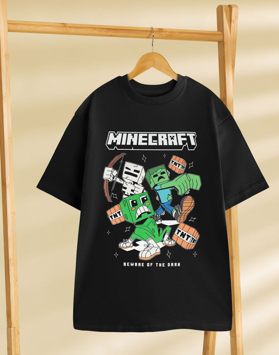 Show off your love for Minecraft with this officially licensed "Beware of the Dark, TNT" crew neck t-shirt, featuring iconic characters on a sleek black design. Perfect for dedicated gamers, this comfortable tee offers a relaxed fit for any occasion, making it an essential addition to your casual wear collection as you embark on your next gaming adventure.