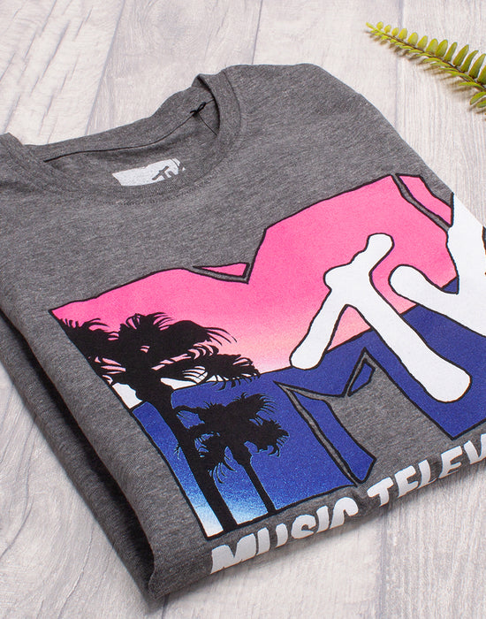 MTV T-Shirt For Women Music Television Palm Tree Logo Gift Ladies Grey Top