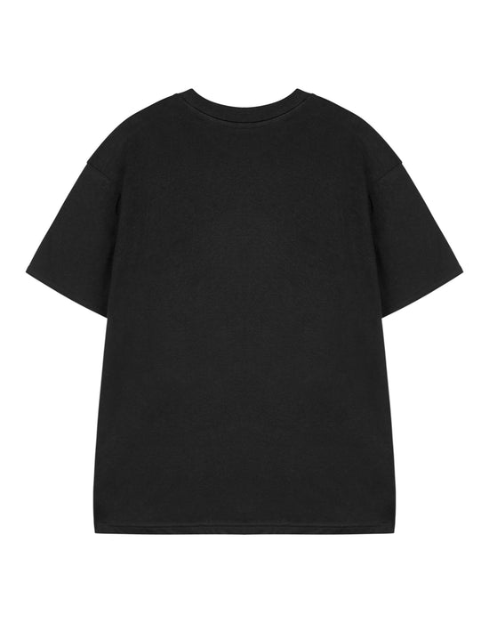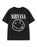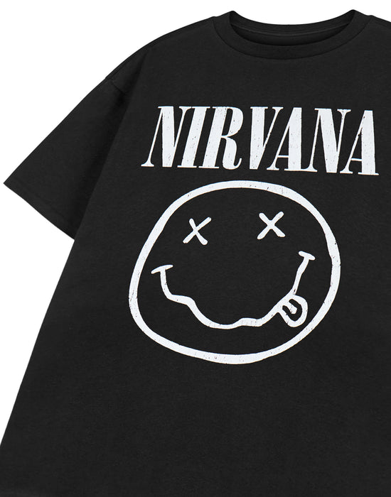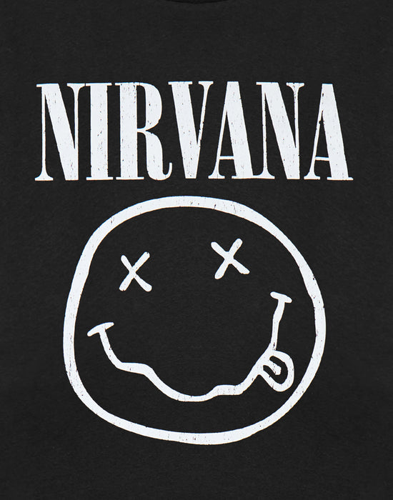 This black boys' t-shirt showcases a faded white Nirvana smiley logo with a stylish all-over spray distress effect, perfect for young rock fans. Made from 100% cotton for ultimate comfort, this officially licensed merchandise combines classic grunge style with everyday wearability.