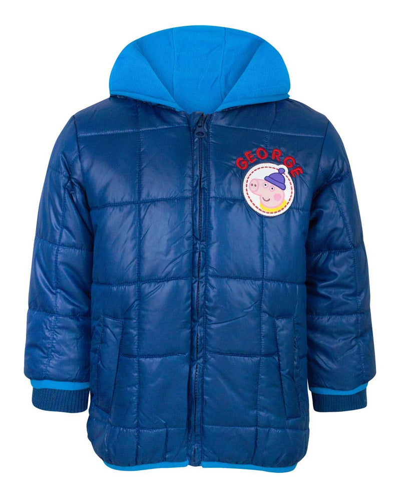 Perfect for little explorers, join in the fun with this officially licensed Peppa Pig boys hooded coat. This coat sees one of our favourite characters George taking pride place on the front left of the coat with his name written in red above. The coat itself offers a hooded neck, long sleeves, handy side pockets, a zip up front and comes in a navy blue with a light blue trim around the hood, arm holes and bottom of coat. The addition of cuffed wrists and a fleece lining in the hood are sure to keep in the warmth on outside adventures.