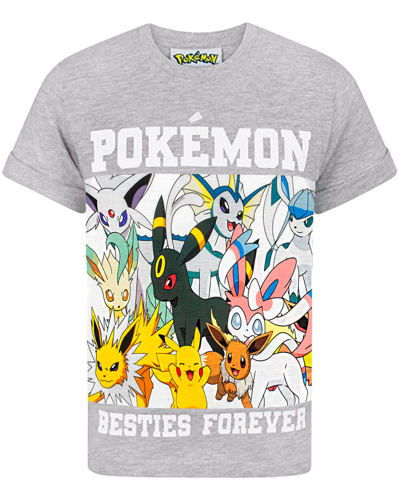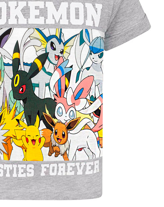 - PIKACHU T SHIRT GIFT FOR HIM – Pokemon merchandise for gamers showcases a panel print of fan-favourite Pokémon character, Pikachu and all the Eevee evolutions on the grey-marl top. The Pokémon clothing for boys features bold text above and below the panel design reading “Pokemon” and “Besties Forever” in a bold white colour, contrasting perfecting against the grey tee.