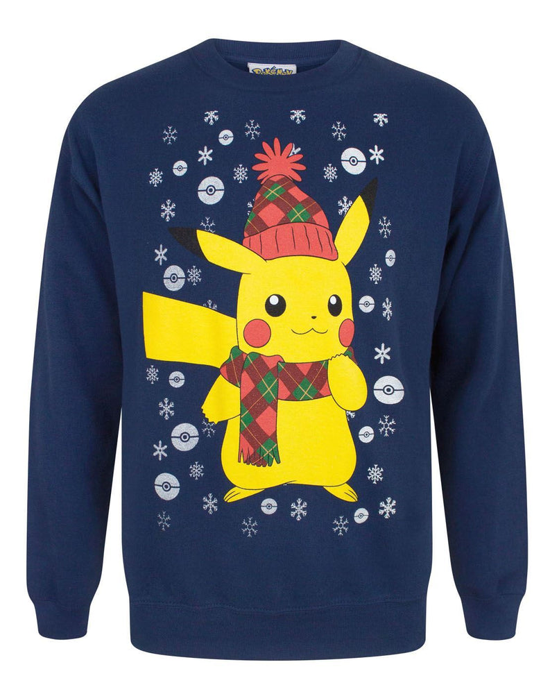 Add some Pokemon style to your Christmas with this super fun Pokemon Pikachu men’s Christmas Sweatshirt! The perfect thing to wear throughout the Christmas period, this sweatshirt sees an adorable print across the front featuring fan-favourite Pokemon, Pikachu! This colourful festive design sees Pikachu decked out in his winter gear, complete with wooly hat and scarf, and backed by a snowflake a pokeball pattern, perfectly mashing Christmas and Pokemon together.