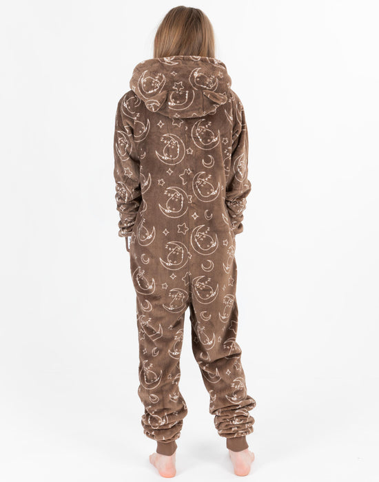 Officially licensed and exclusive to Vanilla Underground, our super soft loungewear onesie comes in brown featuring the animated tabby cat sitting on the moon surrounded by stars.