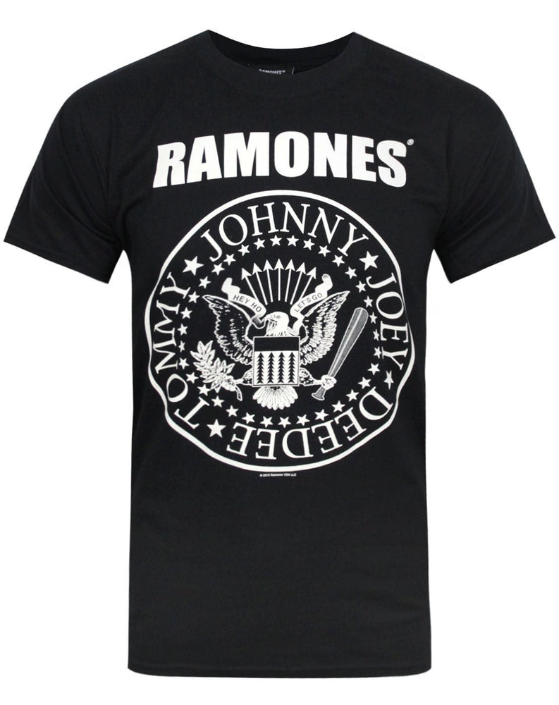This official Ramones Seal mens t-shirt is a cool addition to any fans wardrobe, officially licensed merchandise this awesome t-shirt is the only way to update your band merchandise in style. This mens black t-shirt features a large print of the classic punk rock bands well recognised logo, this t-shirt showcases the Ramones seal logo designed to give off a quintessential American feel inspired by the Presidential Seal. Finished with a high quality look this t-shirt has a classic vintage rock t-shirt feel, packed with great detail. Offering a regular fit this mens Ramones Seal t-shirt comes in a classic black and is made with 100% cotton.