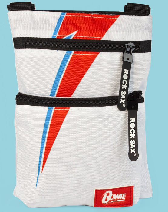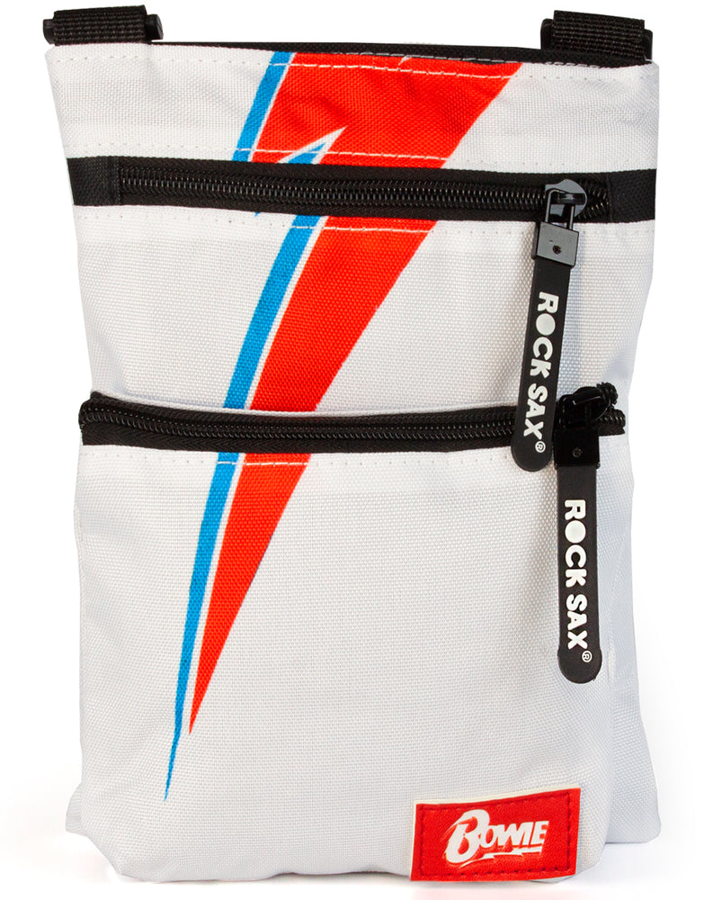 Show your passion for music everywhere you go with this stylish and functional David Bowie body bag. Featuring the lightning bolt artwork from the iconic Aladdin Sane album cover. This bag is very light and durable, perfect to carry around your everyday essentials. The white shoulder bag features an adjustable strap and two zipped pocket compartments. Made from 100% polyester this bag measures approximately 22.5cm x 17.5cm x 3cm. This item is 100% genuine licensed Rock Sax merchandise & features official branding throughout. We want you to get the most out of your new bag, so please be sure to follow all care label instructions and contact our dedicated customer service team for any additional information or sizing queries.