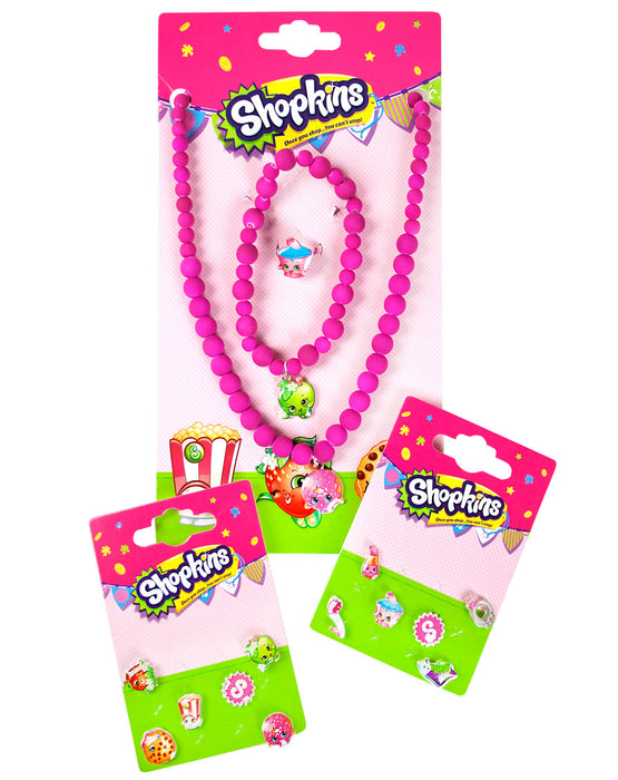 Add some Shopkins Style to your life with this beaded Shopkins jewellery and earring set. This official Shopkins jewellery set includes: bracelet, necklace, ring and 12 single earrings. The stud earrings measuring approximately 10mm x 12mm, featuring all the main characters. Necklace and bracelet feature elasticated string. Not suitable for children under 3 years old due to small parts. Earrings are not suitable for new piercings. Ensure to remove all items before sleep. Due to the nature of this item Please follow all care and safety instructions before use.
