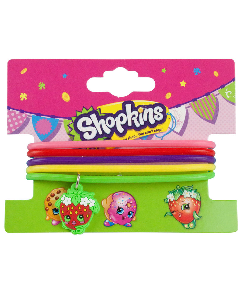 Dress up in Shopkins style with these sweet childrens Shopkins bracelets! Made from five thin rubber bands in green, yellow, pink, red and purple this bracelet pack sees the popular Shopkins character Strawberry Kiss as a small dangling charm attached to the green bracelet band. These Shopkins bracelets are made from slightly stretchy material to easily slip over the hand and comes with official Shopkins branding. Please follow all care and safety instructions before use.