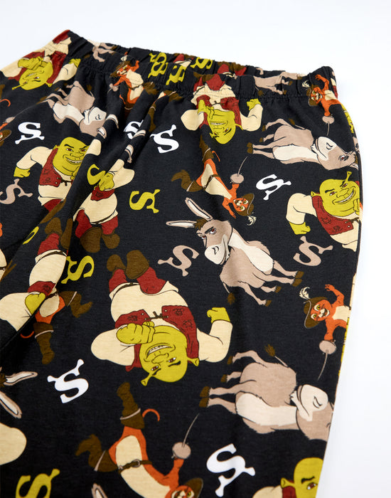 This Shrek-themed loungewear set features a comfortable crew neck top with short sleeves and matching black bottoms, perfect for relaxing at home or enjoying a good night's sleep. Made from soft 100% cotton, it combines functionality with a fun aesthetic, making it an ideal choice for men who are fans of the beloved film franchise and want to showcase their love for Shrek and Donkey while unwinding.