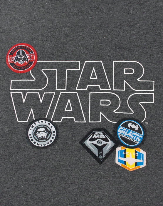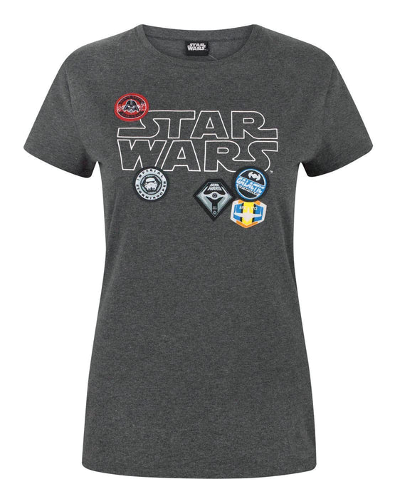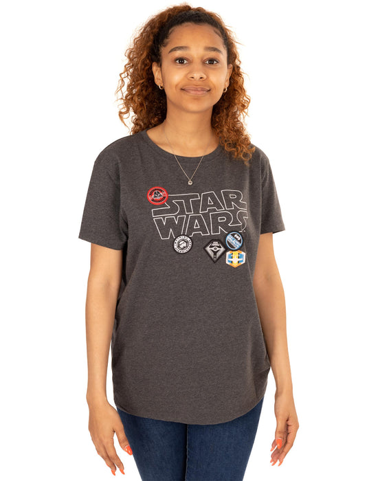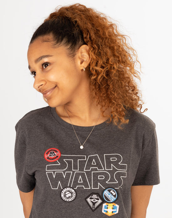 A must have for Star Wars fans, this Star Wars Badges t-shirt for women is a cool addition to any fans collection. Offering something different, this t-shirt features the iconic Star Wars logo in white, surrounded by distinctive Star Wars-themed badges. The detailed badges are stitched into the garment and come in various styles; Darth Vader, Stormtrooper, ARC-170, Galactic Empire and TIE fighter badges complete the look. This womens t-shirt comes in a charcoal marl with standard crew neck and short sleeves along with official Star Wars branding. This Star Wars Badges ladies t-shirt is made from 55% cotton and 45% polyester and offers a standard fit and finish. Please follow all care labels carefully and ask for additional product information if needed.